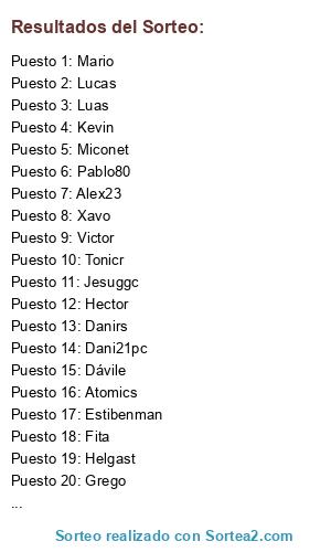 Lista de participantes: Agus, Atomics, Dávile, Dani21pc, Danirs, Estibenman, Fita, Franjviz, Frekky, Grego, Helgast, Hector, Jesuggc, Kevin, Luas, Lucas, Mario, Mico et, Pablo80, Tonicr, Victor, Waly, Xavo, Alex23.