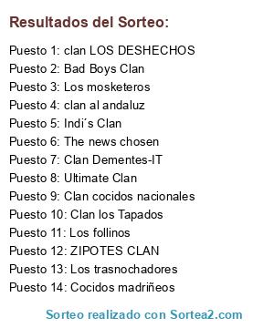 Lista de participantes: clan al andaluz, Cocidos madriñeos, clan LOS DESHECHOS, Los trasnochadores, Clan cocidos nacionales, Clan Dementes-IT, Clan los Tapados, Bad Boys Clan, Indi´s Clan, Los follinos, The news chosen, Los mosketeros, ZIPOTES CLAN, Ultimate Clan.