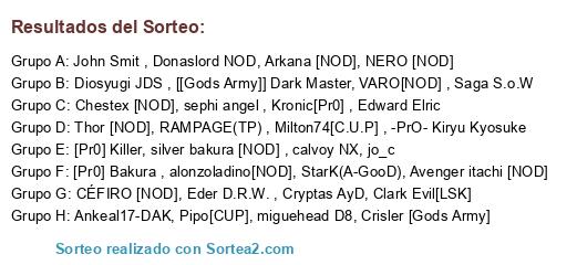 Lista de participantes: Avenger itachi [NOD], silver bakura [NOD] , Arkana [NOD], Saga S.o.W, Chestex [NOD], calvoy NX, RAMPAGE(TP) , [[Gods Army]] Dark Master, sephi angel , VARO[NOD] , Kronic[Pr0] , Clark Evil[LSK] , Diosyugi JDS , Cryptas AyD, Eder D.R.W. , Donaslord NOD, Thor [NOD], -PrO- Kiryu Kyosuke, StarK(A-GooD), Pipo[CUP], Milton74[C.U.P] , alonzoladino[NOD], CÉFIRO [NOD], John Smit , jo_c , miguehead D8, Ankeal17-DAK, Edward Elric, Crisler [Gods Army] , [Pr0] Killer, NERO [NOD], [Pr0] Bakura.