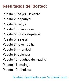 Lista de participantes: sevilla, chelsea, valencia, espanyol, barça, atletico de madrid, malaga, m.united, villareal-getafe, juve - celtic, inter - rayo, bayer - levante.