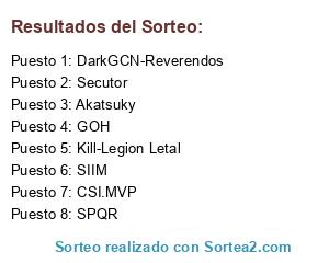 Lista de participantes: GOH, Secutor, Akatsuky, CSI.MVP, SIIM, SPQR, Kill-Legion Letal, DarkGCN-Reverendos.