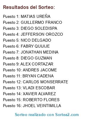 Lista de participantes: DIEGO GUZMAN, MATIAS UREÑA, JHOEL VEINTIMILLA, XAVIER ALVAREZ, FABRY QUIJIJE, GUILLERMO FRANCO, DIEGO SOLEDISPA, NICO DELGADO.