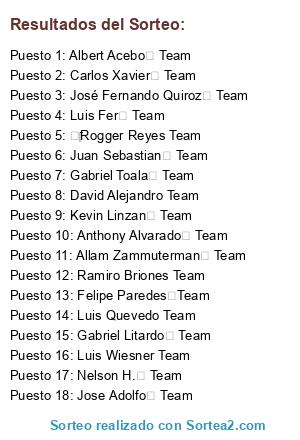 Lista de participantes: Jose Adolfo Team, Anthony Alvarado Team, Albert Acebo Team, Carlos Xavier Team, Felipe ParedesTeam, Gabriel Litardo Team, Gabriel Toala Team, José Fernando Quiroz Team, Juan Sebastian Team, Kevin Linzan Team, Luis Quevedo Team, Luis Wiesner Team, Luis Fer Team, Nelson H. Team, Ramiro Briones Team, Rogger Reyes Team, Allam Zammuterman Team, David Alejandro Team.