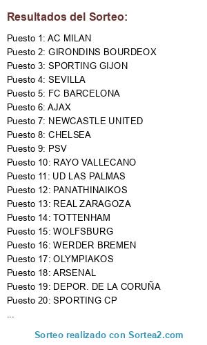 Lista de participantes: RAYO VALLECANO, FC BARCELONA, MALAGA, PANATHINAIKOS, BAYERN MUNCHEN, FIORENTINA, AC MILAN, NEWCASTLE UNITED, AJAX, REAL ZARAGOZA, SEVILLA, CHELSEA, TOTTENHAM, ARSENAL, GIRONDINS BOURDEOX, PSV, UD LAS PALMAS, SPORTING GIJON, DEPOR. DE LA CORUÑA, LIVERPOOL, OLYMPIAKOS, SPORTING CP, WERDER BREMEN, WOLFSBURG.