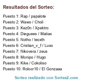 Lista de participantes: Notho / leoxth, Rap / papalote, Monipo / Hugo, Kez0n / Xpektro, Kike / Cokoliso, Wawo / Choli, Cristian_v_f / Luxo, Dieguees / Matias, Nikovera / zeus, Rolocr10 / El Gonzaaa.