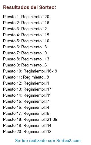 Lista de participantes: Regimiento 1 , Regimiento 2 , Regimiento 3 , Regimiento 4 , Regimiento 5 , Regimiento 6 , Regimiento 7 , Regimiento 8 , Regimiento 9 , Regimiento 10 , Regimiento 11 , Regimiento 12 , Regimiento 13 , Regimiento 14 , Regimiento 15 , Regimiento 16 , Regimiento 17 , Regimiento 18-19 , Regimiento 20 , Regimiento 21-35 , .