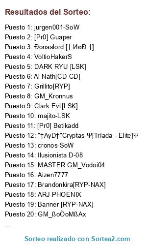 Lista de participantes: †LINKINPARK...LP!†™[C-gm] - (A), [[Gods Army]] Dark Master, CHEMITA, YC_keviin, [Pr0] Bakura, Batalliom((C.B.I)), S.S."†"A&D"†" Anakin, GM_Kronnus, BMºAnimated [TK], majito-LSK, "†ĄяζåŊậ†"ßяİĢåĐiẾя[ИǾĐ], [Pr0] Killer, Al Nath[CD-CD], Đonaslord [† ИøĐ †], Grillito[RYP], Banner [RYP-NAX], "†AyD†"Cryptas Ψ[Tríada - Elite]Ψ, cronos-SoW, jurgen001-SoW, [[Gods Army]] Crisler, Legend [C-gm] (I), Max-Power2260 [TK], Clark Evil[LSK], MASTER GM_Vodoi04, Brandonkira[RYP-NAX], Aizen7777, DARK RYU [LSK], [Pr0] Guaper, VoltioHakerS, IpPo-DAK, Sanji, Near [RYP], ARJ PHOENIX, Silver bakura [NOD], [[Gods Army]]Fénix, GM_MagicBoy, Aiko C-gm, GM_ßoÖoMßAx, Ilusionista D-08, [Pr0] Betikadd.