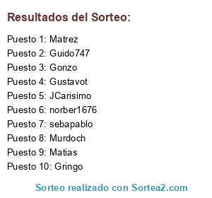 Lista de participantes: Gringo, Matrez, Gonzo, JCarisimo, sebapablo, Matias, Murdoch, Gustavot, Guido747, norber1676.