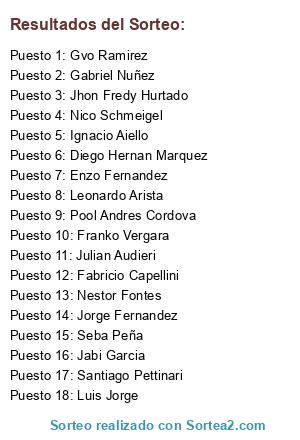 Lista de participantes: Nico Schmeigel, Seba Peña, Jorge Fernandez, Nestor Fontes, Franko Vergara, Gabriel Nuñez, Luis Jorge, Fabricio Capellini, Julian Audieri, Pool Andres Cordova, Leonardo Arista, Enzo Fernandez, Diego Hernan Marquez, Ignacio Aiello, Jabi Garcia, Jhon Fredy Hurtado, Santiago Pettinari, Gvo Ramirez.
