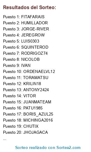 Lista de participantes: ANDRESMORON, ANTONY2424, BBRANDONURU, BORIS_AZUL25, CANTOR29, CHRIS0916, CHUTIX, ELCHILA2016, EMELEXISTAMARQUIUS, FITAFARAIS, GOTENKS, GOTENKS JR, GUASTI, HUMILLADOR, IVAN, JEREGROW, JHOJAGACA, JORGE-RIVER, JUANMATEAM, KURILIN, LUIS0303, MATI-GTI, MAUROMAN, MICHINGA2016, ONEBLOOD, PATU1985, PRINCIPE PENTA, RODRI271, RUSSITO, SEBAMAX1918, SQUINTEROD, TORAMATSU, ORDENAELVL12, NICOLOB, VITOR, BELGRATIAS, RODRIGOZ74, WE_MASTER, KRILIN18, JCARLOS.
