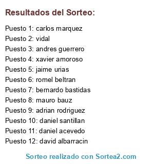Lista de participantes: vidal, xavier amoroso, daniel acevedo, mauro bauz, adrian rodriguez, romel beltran, bernardo bastidas, carlos marquez, jaime urias, david albarracin, daniel santillan, andres guerrero.