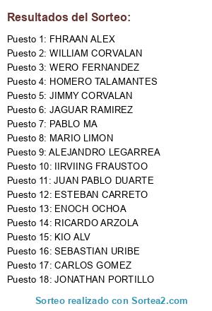 Lista de participantes: JONATHAN PORTILLO, RICARDO ARZOLA, ALEJANDRO LEGARREA, ESTEBAN CARRETO, SEBASTIAN URIBE, WILLIAM CORVALAN, WERO FERNANDEZ, MARIO LIMON, IIRVIING FRAUSTOO, JAGUAR RAMIREZ, CARLOS GOMEZ, JIMMY CORVALAN, JUAN PABLO DUARTE, PABLO MA, ENOCH OCHOA, HOMERO TALAMANTES, FHRAAN ALEX, KIO ALV.