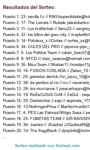 Lista de participantes: @perdy_trs, @Joselito_1003, @rafana04, @osvaldito9, @zequi_pes, @dj_trippy_sanfer, @ismaeljimva, @moisesito, @josee_vlc_91, @poletinho10, @assalito, @sete781, @iker-00, @er_makina1989, @alexisbetico12, @david.tillo, @cielete_maria, @michaelbacas, @intermesas, @se_makiki_16, @israel_febrero, @Sergiroger, @ivi_zizou_10, @ruben_bosch7, @Papasconchocos2010, @espinete_177, @tomce2, @bonus_bcn84, @michel_sanfer, @bcq_85_, @pesleaguelaspalmas, @exonthebigboss, @hintoni, @iban_grao, @pipo_erica, @xori_12, @ALEJANDROFUENTES250, @agustin_duran, @er_moreno_of_lega, @dani_lamakina, @nacho_pes, @fitipaldi_76, @lololin_90, @fernan_buco, @Richi_i.