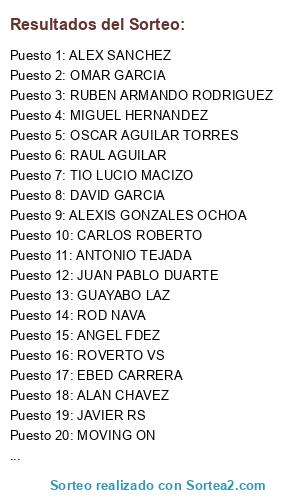 Lista de participantes: MOVING ON, MIGUEL HERNANDEZ, EBED CARRERA, ANTONIO TEJADA, ANGEL FDEZ, LUIS LOPEZ, FALLO AGUBRAA, JAVIER RS, WALTER HAYABUSA, RAUL AGUILAR, CARLOS ROBERTO, DAVID GARCIA, ROVERTO VS, OSCAR AGUILAR TORRES, JUAN PABLO DUARTE, OMAR GARCIA, GUAYABO LAZ, ALEX SANCHEZ, NELSON AVELAR, ROBERTITO JIMENES, LALO TELLO, ROD NAVA, FEYO OLIVER, ALEXIS GONZALES OCHOA, CARLOS EDUARDO, TIO LUCIO MACIZO, RUBEN ARMANDO RODRIGUEZ, JORGE BARBOZA, JUAN CARLOS PADILLA CAMPOS, MEMS ROJO, ROBERTO LERMA, ALAN CHAVEZ.