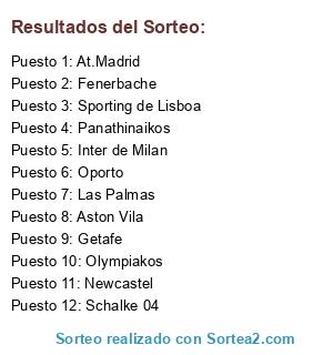 Lista de participantes: At.Madrid, Olympiakos, Panathinaikos, Las Palmas, Aston Vila, Oporto, Inter de Milan, Sporting de Lisboa, Fenerbache, Getafe, Schalke 04, Newcastel.