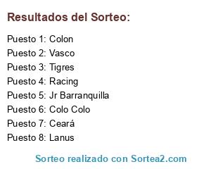 Lista de participantes: Colon, Tigres, Racing, Lanus, Colo Colo, Vasco, Jr Barranquilla, Ceará.