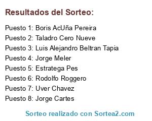 Lista de participantes: Uver Chavez, Boris AcUña Pereira, Rodolfo Roggero, Jorge Meler, Luis Alejandro Beltran Tapia, Estratega Pes, Jorge Cartes, Taladro Cero Nueve.