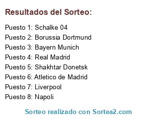 Lista de participantes: Shakhtar Donetsk, Atletico de Madrid, Napoli, Real Madrid, Bayern Munich, Schalke 04, Borussia Dortmund, Liverpool.