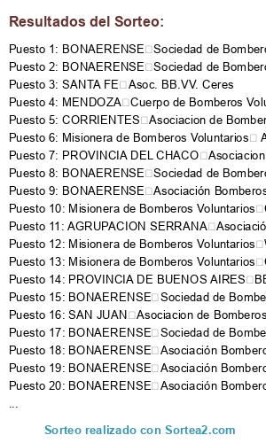Lista de participantes: BONAERENSE Sociedad Bomberos Voluntarios de Florencio Varela, BONAERENSE Sociedad de Bomberos Voluntarios de Berisso, BONAERENSE Asociación Bomberos Voluntarios de Lanus Oeste, BONAERENSE Asociación Bomberos Voluntarios de Brandsen, BONAERENSE Asociación Bomberos Voluntarios de Bellocq, BONAERENSE Asociación Bomberos Voluntarios de Malvinas Argentinas, BONAERENSE Sociedad de Bomberos Voluntarios de Sierra de Los Padres, BONAERENSE Bomberos Voluntarios de Daireaux, BONAERENSE Sociedad de Bomberos Voluntarios de Almirante Brown, BONAERENSE Asociación de Bomberos Voluntarios de Las Flores, BONAERENSE Sociedad de Bomberos Voluntarios de Lobos, BONAERENSE Asociación Bomberos Voluntarios de Bernal, BONAERENSE Asociación Bomberos Voluntarios de San Vicente, BONAERENSE Sociedad de Bomberos Voluntarios de Ezeiza, BONAERENSE Sociedad de Bomberos Voluntarios de Magdalena, BONAERENSE Asociación Bomberos Voluntarios de Sarandi, BONAERENSE Sociedad de Bomberos Voluntarios de General Piran, BONAERENSE Asociación del Cuartel de Bomberos Voluntarios Tristan Suarez, Carlos Spegazzini y La Union, SAN JUAN Asociacion de Bomberos Voluntarios de San Jose Jachal, AGRUPACION SERRANA Asociacion Civil Bomberos Voluntarios de Villa Rio, AGRUPACION SERRANA Asociacion de Bomberos Voluntarios de San Marcos Sierra, AGRUPACION SERRANA Asociacion civil de Bomberros Voluntarios de Los Cocos, AGRUPACION SERRANA Asociacion Civil Bomberos Voluntarios Las Higueras, AGRUPACION SERRANA Asociacion Civil Bomberos Voluntarios de Cruz del Eje, AGRUPACION SERRANA Asociacio de Bomberos Voluntarios de Mendiolaza, AGRUPACION SERRANA Asociación civil de Bomberos Voluntarios de Las Arrias, AGRUPACION SERRANA Asociación de Bomberos Voluntarios Villa Tulumba, AGRUPACION SERRANA Sociedad de Bomberos voluntarios de saldan, PROVINCIA DEL CHACO Asociacion Civil Bomberos Voluntarios de Fontana, Neuquina de Bomberos Voluntarios Asociación Bomberos Voluntarios Villa Lago Meliquina, Neuquina de Bomberos Voluntarios Asociación Bomberos Voluntarios de Las Lajas, Neuquina de Bomberos Voluntarios Asociación Bomberos Voluntarios de Añelo, Neuquina de Bomberos Voluntarios Asociación Bomberos Rincón de los Sauces, Neuquina de Bomberos Voluntarios Asociación Bomberos Voluntarios Junín de los Andes, Neuquina de Bomberos Voluntarios Asociación Bomberos Voluntarios de Plottier, Neuquina de Bomberos Voluntarios Asociación Bomberos Voluntarios Cutral-Co, Neuquina de Bomberos Voluntarios Federación Neuquina de Bomberos Voluntarios de Neuquén, DEL NORTE DE ASOC. DE TUCUMAN FEDERACION DEL NORTE DE ASOC. DE BV TUCUMAN, DEL NORTE DE ASOC. DE TUCUMAN ASOCIACION DE BOMBEROS VOLUNTARIOS DE TRANCAS,, DEL NORTE DE ASOC. DE TUCUMAN ASOCIACION DE BOMBEROS VOLUNTARIOS DE BURRUYACU,, DEL NORTE DE ASOC. DE TUCUMAN ASOCIACION DE BOMBEROS VOLUNTARIOS DE LAS TALITAS,, Misionera de Bomberos Voluntarios ASOCIACION DE BOMBEROS VOLUNTARIOS Aristóbulo del Valle, Misionera de Bomberos Voluntarios ASOCIACION DE BOMBEROS VOLUNTARIOS Bernardo de Irigoyen, Misionera de Bomberos Voluntarios ASOCIACION DE BOMBEROS VOLUNTARIOS Campo Grande, Misionera de Bomberos Voluntarios ASOCIACION DE BOMBEROS VOLUNTARIOS Cte. Andresito, Misionera de Bomberos Voluntarios ASOCIACION DE BOMBEROS VOLUNTARIOS Cerro Azul, Misionera de Bomberos Voluntarios ASOCIACION DE BOMBEROS VOLUNTARIOS El Soberbio, Misionera de Bomberos Voluntarios ASOCIACION DE BOMBEROS VOLUNTARIOS Garuhapé, Misionera de Bomberos Voluntarios ASOCIACION DE BOMBEROS VOLUNTARIOS Jardín América, Misionera de Bomberos Voluntarios ASOCIACION DE BOMBEROS VOLUNTARIOS Leandro N. Alem, Misionera de Bomberos Voluntarios ASOCIACION DE BOMBEROS VOLUNTARIOS Oberá, Misionera de Bomberos Voluntarios ASOCIACION DE BOMBEROS VOLUNTARIOS Posadas, Misionera de Bomberos Voluntarios ASOCIACION DE BOMBEROS VOLUNTARIOS Ruiz de Montoya, Misionera de Bomberos Voluntarios ASOCIACION DE BOMBEROS VOLUNTARIOS San José, Misionera de Bomberos Voluntarios ASOCIACION DE BOMBEROS VOLUNTARIOS San Javier, Misionera de Bomberos Voluntarios San Ignacio, Misionera de Bomberos Voluntarios San Pedro, Misionera de Bomberos Voluntarios San Vicente, Misionera de Bomberos Voluntarios Bernardo de Irigoyen, Misionera de Bomberos Voluntarios Wanda, Misionera de Bomberos Voluntarios Corpus Christi, Misionera de Bomberos Voluntarios Dos de Mayo, Misionera de Bomberos Voluntarios Candelaria, DE SANTIAGO DEL ESTERO Asociación de BB.VV. de Las Termas de Rio Hondo, DE SANTIAGO DEL ESTERO Asociación de BB.VV. de Bandera, DE SANTIAGO DEL ESTERO Asociación de BB.VV. de Loreto, DE SANTIAGO DEL ESTERO Federación de Bomberos Voluntarios de Santiago del Estero, DE SANTIAGO DEL ESTERO Asociación de Bomberos Voluntarios de La Banda, DE SANTIAGO DEL ESTERO Asociación de Bomberos Voluntarios de Quimili, ENTRERRIANA DE BOMBEROS VOLUNTARIOS Asociación de BBVV de Santa Elena, SANTA FE Asoc. BB.VV. Peyrano, SANTA FE Asoc. BB.VV. Olivero, SANTA FE Asoc. BB.VV. Pujato, SANTA FE Asoc. BB.VV. Ceres, CORRIENTES Asociacion de Bomberos Voluntarios de Saladas, CORRIENTES Asociacion Bomberos Voluntarios de Corrientes Capital, MENDOZA Cuerpo de Bomberos Voluntarios de Godoy Cruz, CENTRAL CHACO Asociación de Bomberos Voluntarios de la Capital Botánica, CENTRAL CHACO Asociación Civil Bomberos Voluntarios Colonia Aborigen Chaco, CENTRAL CHACO Asociación Bomberos Voluntarios de Machagai, CENTRAL CHACO Asociación de Bomberos Voluntarios Zona Sur, CENTRAL CHACO Asociación de Bomberos Voluntarios Donovan, PROVINCIA DE BUENOS AIRES BB.VV. Gral. Sarmiento, PROVINCIA DE BUENOS AIRES BB.VV. Gral San Martn, PROVINCIA DE BUENOS AIRES BB.VV. Lujan, PROVINCIA DE BUENOS AIRES BB.VV. 9 de Julio, PROVINCIA DE BUENOS AIRES Asociación BV de Hurlingham.