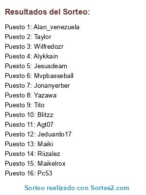 Lista de participantes: Agt07, Riizalez, Blitzz, Jonanyerber, Jeduardo17, Alan_venezuela, Pc53, Alykkain, Mvpbasseball, Maikelrox, Wilfredozr, Taylor, Jesusdeam, Tito, Yazawa, Maiki.