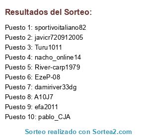 Lista de participantes: efa2011, javicr720912005, damiriver33dg, nacho_online14, A10J7, River-carp1979, pablo_CJA, sportivoitaliano82, Turu1011, EzeP-08.