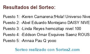 Lista de participantes: -Brenda Barrios :)., -Kevin Lizarraga Moran Kevin 31, -Achu Darquier yooooo LOLA CULLEN-NIVEL:36, -Ezequiel Alejandro Gonzalez Estrada yo rawr nivel 100 -w- suerte n.n, -Annaa Pau Q yooo, -Kátítá Pét Sócíétý Hola soy nueva, -Maria Guadalupe paduana nivel 85, -Gina Zacarias yooo lady gaga nivel 42 ♥♥♥, -Rubi A. Aurelio Gomez YOOO!!:d, -Ana Carolina MARIPOSA 28, -ChErry Candy ffufurupantro nivel 31, -Keren Camarena !Hola! Universo Nivel 36 ♥♥♥♥, -Eddson Omar Esquives Saenz ROUSSE NIVEL:34, -Romina Franggi ;D, -Knela Mendoza chintola novel 36, -'Nuju Chen Yoop!! :), -Lisa Kamegawa lissa*36, -Ludmila Herrera Nagi Sanzenin-29, -Ady Alarcon Yooo, -Claudia Camacho D'Landey LOLA 100, -Vero Nika yop n.n, -Deara Vaughn Iop :D xD, -Linda Reyes hemozitap nivel 100, -Xio Mayus Martinez yoooo, -Gigi Rodriguez yoyoyoyoyoyoyo, -Zoel Corgan felix 32, -Abel Eduardo Montejano DAISY NIVEL 100, -Mariaa Fernanda Avendaño Leon Elisa nivel:32, -La Sofí Bolsilluda Lucy nivel: 40.
