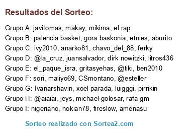 Lista de participantes: amenasu, sori, CSmontano, el_paque_isra, rafa gm, jeys, Ivanarshavin, aburito, nigeriano, pirrikin, juansalvador, dirk nowitzki, litros436, @esteller, mikima, etnies, xoel parada, palencia basket, ferky, @tiki, michael golosar, @aiaiai, el rap, maliyo69, ben2010, luigggi, chavo_del_88, @la_cruz, gritasyehas, fireslow, gora baskonia, ivy2010, javitomas, nokian78, anarko81, makay.