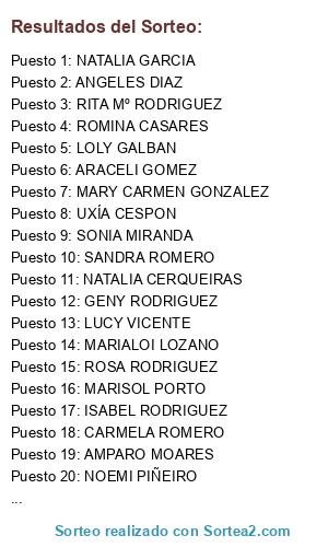 Lista de participantes: NOEMI PIÑEIRO, RITA Mº RODRIGUEZ , MARIALOI LOZANO, SONIA MIRANDA , PAULA HERNANDEZ, DOLORES VARELA, ROSA RODRIGUEZ, LOLY GALBAN, MARISOL PORTO, ISABEL RODRIGUEZ, UXÍA CESPON, AZUL DO MAR, ADRIANA RIAL, ANGELES DIAZ, ROSA Mº ROMERO, CARMELA ROMERO, ARACELI GOMEZ, ROMINA CASARES, GENY RODRIGUEZ, SANDRA ROMERO, LUCY VICENTE, KATIA CAMIÑO, NATALIA GARCIA, AMPARO MOARES, NATALIA CERQUEIRAS, MARY CARMEN GONZALEZ.