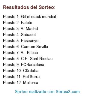 Lista de participantes: FCBarcelona, Reial Mandril, At.Madrid, Ecspanyol, Sabadell, Villa-Reial, C.E. Sant Nicolau, At. Bilbao, Osasuna, Mallorca, C0rdoba, Falete, Carmen Sevilla, Pol Serra, Gil el crack mundial, Caca, cagada, super cagadisima.