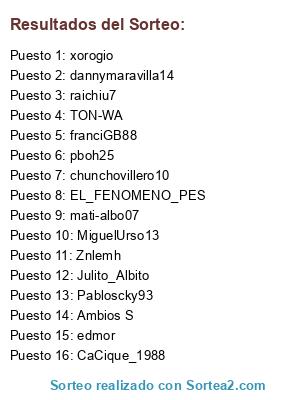 Lista de participantes: Ambios S, chunchovillero10, CaCique_1988, edmor, Pabloscky93, TON-WA, EL_FENOMENO_PES, MiguelUrso13, xorogio, Julito_Albito, dannymaravilla14, mati-albo07, franciGB88, Znlemh, raichiu7, pboh25.