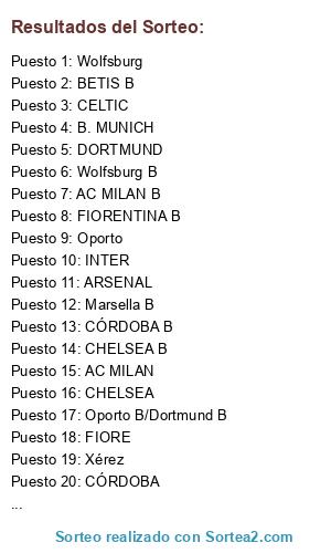 Lista de participantes: AC MILAN, AC MILAN B, FIORENTINA B, ARSENAL, ARSENAL B, BETIS, BETIS B, DORTMUND, CELTIC, CHELSEA B, CÓRDOBA B, JUVE, JUVE B, INTER B, LIVERPOOL B, VALENCIA, Wolfsburg, Wolfsburg B, Xérez, Xérez B, Marsella B, LIVERPOOL, A. MADRID, Marsella, Oporto, Oporto B/Dortmund B, B. MUNICH, CHELSEA, Sevilla, INTER, FIORE, CÓRDOBA.