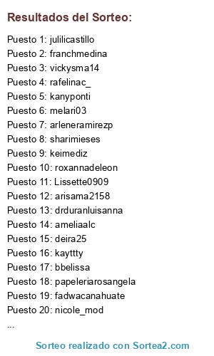 Lista de participantes: evelynandeliz (2), gicelledelapaz (4), perezanyely (4), bigny_candela84 (3), taycouturestudio (4), sothyortiz (6), lcl1203 (4), adaljisanairobi (4), marifer.inoa (3), yndiana26 (6), indhirabm, rafelinac_ (5), natzlopez (3), mariamatildenuñez, cbrugal (3), keniapoloniap, jatnnafdez, madelynbatistab, ccijst98 (4), angelina_brit (6), susanaschiffino, avisvasquez (4), emelyarline, anildapaez, joelinadelorbe03 (6), sharimieses (6), yirandigonzalez, Marlenerp1, franchmedina (3), arleneramirezp (6), dennyperez25 (3), marymary409, karinarojas, yahairafarias, nancyramirezq (6), bmsm2101 (3), arisama2158 (4), bm.saldivar (2), lidiacastillom (3), fadwacanahuate (3), patriciamustonen (2), karlamoba (2), caribe1620 (6), kayttty (6), Belkis.0226 (6), gryseldaapolinario (6), Lissette0909 (4), maritza_2210 (6), karliperdomo (6), arlinerod (5), cindyquezada1 (6), patrodnova (4), montsevinals (2), irenelr4 (3), sauly5659 (3), instaclaudiard (5), zuleidysoto (6), danny_crystal08 (4), keimediz (6), aw_noelia (6), nicole_mod (6), maria_rodriguezflorentino (6), yira.padilla (6), felicianaalmonte (3), roxannadeleon (2), erikafonerin (4), gvpvargas (5), melari03 (4), roxyreyes15 (5), julilicastillo (6), josefinasotom (4), zunyqd (3), bbelissa, uvepb (2), mliss0986 (4), kamelats, beshadiva09 (6), miguelinacaroli_65 (3), laprofecarmona, flora.maribel (5), emyp.30 (2), mpd_16 (6), beauty.ady (6), _imc31_ (4), anyelina_parra (5), geminis2524 (2), justaalmonte (3), alydenia, nidiaestherr, zuly2309, suero91 (6), yoermialexandra (3), Glennysserrata (4), onskyy (5), parbaje, _naby (2), normitaj, _anster (5), melissasantanac (2), nialcantara1812 (2), marielita06 (3), yaniratavarez, deyaniraristy (2), andhiara05, denisseadrianna_, jafmaryf, gabrielaj10, gloria29irene, papeleriarosangela (3), wsantanao, mariapolancoa, ameliaalc (3), oriselsanchez, aurydania, awilda_makeup (6), yadiranunez22, anarocks14 (2), rcarrasco02131961 (3), de_biihdez (6), jessmel04, emi101083, arisleydar02 (2), gp_medrano_rd (2), rosello.isabel, linettepd, irmaconcepciónm (3), valkypr (2), licelottgil, kanyponti (6), zulezule08 (2), anadeliss, rociobrea, sairareynosoo, yanerisgarcia_19, dilennyvldz (5), caroltrends, nathyajimenez (2), les_lie17, alba2814 (5), candymarilyn_nunez14 (6), ariislady, larubiadoro16, drduranluisanna (3), Reyeskiria (3), monicalogrono, Paolatorresx3 (2), nwoss, Dennyteresa01, geldigrullon, kashmiramercedes, georginaminier, biancamorelrincon, leonirisolivercuello (2), raisaadames08 (5), eridaniaorbe (3), villegasnathaly90, fior_mejia, elizabethmorel91, kalhiesita, santanacanela05, vickysma14 (5), feliciamamis, licda.corporan (6), nika_rosa45 (3), migno2972, periodistajimenez (3), beregueteteodosia, polanco.elba (4), sendyguerrero, onaisirijo (4), cathalmontep (4), deira25 (5), xiomaradlcm30 (4), anginetterodriguez (2), yisselramirezfdez, mariademota (2), karlafranjul (3), gisellvillar, veronike20, chaynesag, francelinabrito (2), mahoarmenteros, melissaurena25 (2), sarairguez, lopez_lopez25 (3), arlenicesan, angie238c (3), kcr029, luchymoquete (2).
