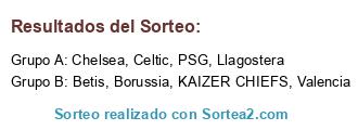 Lista de participantes: Chelsea, Llagostera, KAIZER CHIEFS, Betis, Celtic, PSG, Valencia, Borussia.