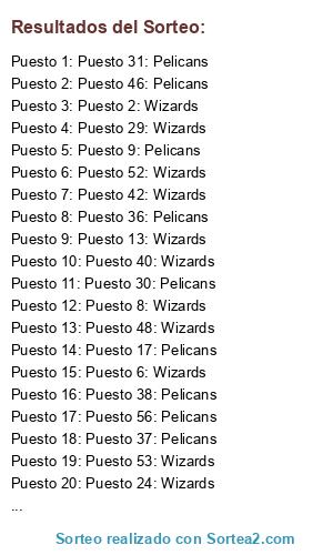 Lista de participantes: Puesto 1: Pelicans, Puesto 2: Wizards, Puesto 3: Pelicans, Puesto 4: Pelicans, Puesto 5: Pelicans, Puesto 6: Wizards, Puesto 7: Wizards, Puesto 8: Wizards, Puesto 9: Pelicans, Puesto 10: Pelicans, Puesto 11: Wizards, Puesto 12: Wizards, Puesto 13: Wizards, Puesto 14: Pelicans, Puesto 15: Pelicans, Puesto 16: Wizards, Puesto 17: Pelicans, Puesto 18: Pelicans, Puesto 19: Wizards, Puesto 20: Pelicans, Puesto 21: Wizards, Puesto 22: Pelicans, Puesto 23: Wizards, Puesto 24: Wizards, Puesto 25: Pelicans, Puesto 26: Wizards, Puesto 27: Pelicans, Puesto 28: Pelicans, Puesto 29: Wizards, Puesto 30: Pelicans, Puesto 31: Pelicans, Puesto 32: Wizards, Puesto 33: Wizards, Puesto 34: Pelicans, Puesto 35: Pelicans, Puesto 36: Pelicans, Puesto 37: Pelicans, Puesto 38: Pelicans, Puesto 39: Wizards, Puesto 40: Wizards, Puesto 41: Wizards, Puesto 42: Wizards, Puesto 43: Pelicans, Puesto 44: Wizards, Puesto 45: Wizards, Puesto 46: Pelicans, Puesto 47: Pelicans, Puesto 48: Wizards, Puesto 49: Pelicans, Puesto 50: Pelicans, Puesto 51: Pelicans, Puesto 52: Wizards, Puesto 53: Wizards, Puesto 54: Pelicans, Puesto 55: Pelicans, Puesto 56: Pelicans.
