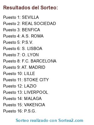 Lista de participantes: SEVILLA, F.C. BARCELONA, LAZIO, P.S.G., MALAGA, O. LYON, VAKENCIA, LILLE, A.S. ROMA, STOKE CITY, BENFICA, S. LISBOA, AT. MADRID, LIVERPOOL, P.S.V., REAL SOCIEDAD.