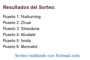 Lista de participantes: Imola, Nurburning, Abudabi, Monvelot, Zhuai, Silvestone, Brno, Spa, Monza.