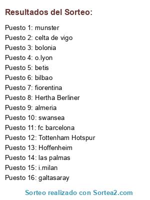 Lista de participantes: Tottenham Hotspur, galtasaray, las palmas, Hoffenheim, fiorentina, o.lyon, i.milan, munster, swansea, celta de vigo, Hertha Berliner, almeria, betis, bolonia, bilbao, fc barcelona.