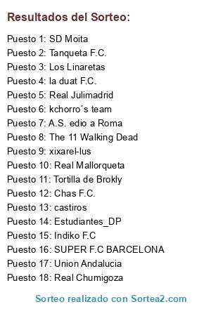 Lista de participantes: Estudiantes_DP, A.S. edio a Roma, kchorro´s team, Los Linaretas, la duat F.C., xixarel-lus, Real Chumigoza, castiros, The 11 Walking Dead, Tortilla de Brokly, Real Mallorqueta, Real Julimadrid, SUPER F.C BARCELONA, Indiko F.C, Tanqueta F.C., SD Moita, Union Andalucia, Chas F.C..