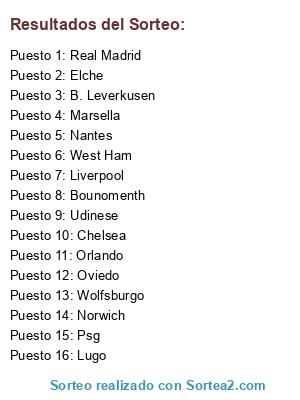 Lista de participantes: Nantes, Chelsea, Bounomenth, Lugo, Marsella, Orlando, Oviedo, Wolfsburgo, Udinese, Elche, B. Leverkusen, Psg, West Ham, Norwich, Real Madrid, Liverpool.