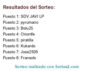 Lista de participantes: pyrumano, Jose2509, Oriontfe, Kukardo, piratilla, Bolu25, Fransolo, SDV JAVI LP.