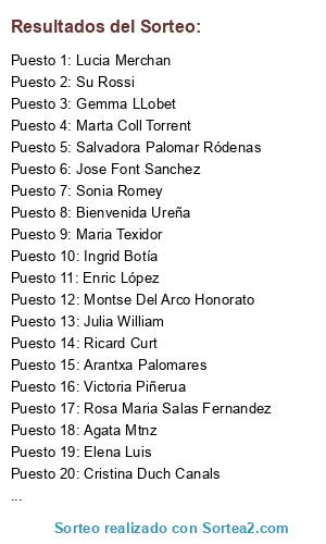 Lista de participantes: Anna Alastrue, Jennifer Ponce, Sonia Romey, Fanny porta nobell, Elena Fueyo Marcos, Ana Gilde, Cristina Duch Canals, María Rosa Fueyo, Víctor Manuel Moya Fernández, Marc Aibar Colomé, Noemí Gonzalez, Minty Ascención, Angeles Hernandez, Conrada Moreno Fernandez, Asier López de Munain, Sílvia Sirera, Melanny Osuna, Cristina Tolo Jornet, Oscar Escribano, Benjamin Palfer-Sollier, Javi Martinez Diez, Gabriella Herrera, Victoria Piñerua, Luisa Giner Rodriguez, CJulian Castellanos, Sònia Miarnau, Nubel De Amo Iván Bcn, Paola Occhipinti, Mercedes Castelló Rodriguez, Lorena Sánchez, Joan Batista Roige, Mar Solana Castro, Julia William, Marta Parera, Sandra Molina Mur, Nora Hernandez, Leire Laboreo, Carme Mangues, Susanna Valderrama Ruiz, Alina Orrico, Sandra Romero, Eduard Rubio Badia, Barbara Prieto Castro, Ingrid Botía, Stefano Paddeu, Gádor Martínez, Arnau Montserrat palou, ALICIA SÁNCHEZ SORIANO, Arantxa Palomares, Josefa Fernandez, Eloy Reche, Johnny Borrell Mannix, Dennys Jesus Toribio Pedraza, Su Rossi, Maria Pous, Judit Atalao Carrique, Sonia Ezquerra, David Simal, Ariadna Pera Cano, Laura Gallardo Molina, Alba Montes Val, Rosa Lozano Reategui, Sandra Pavon, Maria Texidor, Cristina Chocolat, tomas m javierre, Montse Viudez Ortuño, Oscar Valero, Elena Quinto Viñolo, Lorena Mora Gómez, Laura Hernandez Castillo, Cristina Muñoz, Vanda Goreti Waskievicz, Darío López, Cristina Castelló Sánchez, Jose Maria Sese Villanova, Enric Casadó Tartera, Susana Picón, Marina Torndelacreu Díez, Jose Font Sanchez, Marta Coll Torrent, Ruben Escudero Jimenez, Bodegas La Crusset / Oscar Reboredo, Noli Riesco Garcia, Vicky Molina Garcia, Ricard Curt, Olga Erra, Mònica Gelabert Diaz, Joel Atalao Carrique, Saran Donga, Aldo Jimenez, Laia Casals, Patxi El Pela, Pilar Cerrutti, Inés de Valicourt, Ariadna Soto, Veronica Garcia Arreaga, Elisabet Sanahuja, Tomas Magallon, Han Na, Roger Pedret Pijoan, Belén Martínez Noain, Luis Enrique Moreno lastra , Josep Canaves Escobairóp , Rebecca Falconi, Ana Quero, Marga Castell Barbany, Alvar gomez, Sandra Pla, Núria Sánchez Nomdedeu, Raúl Nuevo, Joanna Sánchez Rivadeneyra, Mar Hernández, Sara Ruiz Arranz, Enric López, Alexandra Bunda, Sophie Pusch, Consol Ollé, Blanca Boncompte, Katie Smitten, Ana Villuendas Esteban, Mercè Juncà, Carmen Serrano Herrero, Clara Valls Moreno , Diego Viedma, Esther López, Ana Cintora Quero, Ricardo vicente Riazor, Andrea Del Águila Pérez, Cristina Murtra, Gemma LLobet, Lena Olifirovitch, Anna Isabel Pérez Leal, Jaume Alcantara, Maria Merce Palau Imbern, Blanca Olivares Navarro, Anna Hernandez, Teresa Cabasés Latorre, Nuria Llorach Molons, Anna Rosell Belloc, Anna GP, Ramon Solà, Teresa Serarols, Maria Anguera, Miguel Garcia Cobo, Francesc Saldaña Buesa, Nati Torres, Josemari Toro, Carmen Ferrer Barbera, Miguel Montaño, Mary Pastor, Lucia Merchan, Montse Del Arco Honorato, Elisenda Morera, Angelo Landi, Maria Jose Gonzalez Navarro, Lluís Permanyer Sala, Cristina Civico Gomez, Ana M. Pulido Rodriguez, Mayte Sanchez, Carme Adalia Bartolome, Victòria Suller Loriz, Rosa Maria Salas Fernandez, Romina EC, Agata Mtnz , María Jesús Jurado Pizarro, Andrea Cortés , Mònica Benages Milà, Bienvenida Ureña, Merce Rius Almoyner, Elena Luis, Salvadora Palomar Ródenas, Dani Velasco, Jaime A González.