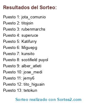 Lista de participantes: titojoin, jemy6, alber_atleti, tito_higuain, Katifurry, tetokun, jota_comunio, jose_medi, kunsito, scotifield puyol, rubenmarchs, superuce, Miguepg.