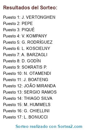 Lista de participantes: THIAGO SILVA, SERGIO RAMOS, J. BOATENG, PIQUÉ, D. GODÍN, J. VERTONGHEN, PEPE, JOÃO MIRANDA, M. HUMMELS, V. KOMPANY, G. RODRÍGUEZ, G. CHIELLINI, L. BONUCCI, L. KOSCIELNY, N. OTAMENDI, A. BARZAGLI, SOKRATIS P..