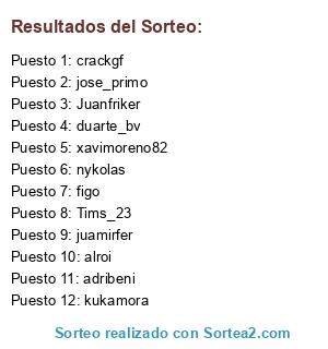 Lista de participantes: kukamora, adribeni, crackgf, alroi, xavimoreno82, figo, nykolas, Juanfriker, jose_primo, duarte_bv, Tims_23, juamirfer.