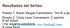 - Ganador 2: Cristy Leon Comentario: C apricho R ed velvet I me encanta zanahoria S oleta fresa T res leches Y ogurth delicia