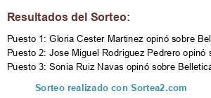 Lista de participantes: Carmen C. Sánchez opinó sobre Belletica: 4 estrellas, Ana Muruaga opinó sobre Belletica: 5 estrellas, Cristina Rodriguez Alonso opinó sobre Belletica: 1 estrella, Isabel Casado opinó sobre Belletica: 4 estrellas, Arianna Mayo opinó sobre Belletica: 5 estrellas, Aida Viejo opinó sobre Belletica: 3 estrellas, Eva Bustamante opinó sobre Belletica: 1 estrella, Pablo Lopez Mauriño opinó sobre Belletica: 5 estrellas, Janny Carrillo opinó sobre Belletica: 5 estrellas, JoseManuel Sanjuan Fernandez opinó sobre Belletica: 5 estrellas, Maria Gamarra Vila opinó sobre Belletica: 5 estrellas, Noa Piñeiro opinó sobre Belletica: 1 estrella, Ana Garcia opinó sobre Belletica: 4 estrellas, Maria Jose Becerra Olavarria opinó sobre Belletica: 4 estrellas, Estefania Puchades opinó sobre Belletica: 3 estrellas, Reyes Abad Rabanal opinó sobre Belletica: 5 estrellas, Helena Miranda Barea opinó sobre Belletica: 5 estrellas, Yolanda Guzmán opinó sobre Belletica: 5 estrellas, Noemi Colom opinó sobre Belletica: 5 estrellas, Silvia Santiago Rivero opinó sobre Belletica: 5 estrellas, Pop Aurelia opinó sobre Belletica: 5 estrellas, Aida Fernández Gutiérrez opinó sobre Belletica: 5 estrellas, Lourdes Ibarz Zambudio opinó sobre Belletica: 5 estrellas, Antonio Muñoz Sanchez opinó sobre Belletica: 4 estrellas, Cecilia Gómez opinó sobre Belletica: 5 estrellas, Uxia Ricoy Veintitres opinó sobre Belletica: 5 estrellas, Mario Antonio Afonso Martins opinó sobre Belletica: 5 estrellas, Laura Chinchilla opinó sobre Belletica: 5 estrellas, Yolanda Contreras Caparrini opinó sobre Belletica: 5 estrellas, Maribel San opinó sobre Belletica: 5 estrellas, Yolanda Izquierdo opinó sobre Belletica: 5 estrellas, Natalia Hdez opinó sobre Belletica: 5 estrellas, Anamaria Varga opinó sobre Belletica: 5 estrellas, Sol Guerra opinó sobre Belletica: 5 estrellas, Asunta Medina opinó sobre Belletica: 3 estrellas, Judith Saura opinó sobre Belletica: 5 estrellas, Anabel Gil Dubuisson opinó sobre Belletica: 5 estrellas, Ga Suanzes Riesgo opinó sobre Belletica: 5 estrellas, Silvia Sil opinó sobre Belletica: 5 estrellas, Maria Eme Zeta opinó sobre Belletica: 5 estrellas, Maria Jesus Aguilar Royo opinó sobre Belletica: 5 estrellas, Marly Sten opinó sobre Belletica: 5 estrellas, Júlia Pardo opinó sobre Belletica: 4 estrellas, Esther Ron opinó sobre Belletica: 1 estrella, Sose Conk opinó sobre Belletica: 5 estrellas, Alba Garcia opinó sobre Belletica: 4 estrellas, Martita Muriel opinó sobre Belletica: 5 estrellas, Celia Madrid Miquel opinó sobre Belletica: 4 estrellas, Yolanda GF opinó sobre Belletica: 5 estrellas, Yolanda Segovia opinó sobre Belletica: 5 estrellas, Sonia Fernández Barrero opinó sobre Belletica: 5 estrellas, Ángeles Casanova Alonso Yorkimay opinó sobre Belletica: 5 estrellas, Sandra Fuentes opinó sobre Belletica: 5 estrellas, Yolanda Espada Sanchez opinó sobre Belletica: 5 estrellas, Ana Collantes opinó sobre Belletica: 5 estrellas, Marce Ama opinó sobre Belletica: 5 estrellas, Elsa Rodriguez Celemin opinó sobre Belletica: 5 estrellas, Marta PM opinó sobre Belletica: 5 estrellas, Susana Marco Fernandez opinó sobre Belletica: 4 estrellas, Adela Raposo opinó sobre Belletica: 5 estrellas, Sofia Ramos opinó sobre Belletica: 5 estrellas, Olatz Agirre opinó sobre Belletica: 1 estrella, María López Hernández López Hernández opinó sobre Belletica: 5 estrellas, Evelyn Solá López opinó sobre Belletica: 5 estrellas, Susana Suka Suka Gutierrez Saucedo opinó sobre Belletica: 5 estrellas, Sonia Ruiz Navas opinó sobre Belletica: 5 estrellas, Carolina Morales opinó sobre Belletica: 5 estrellas, Lucía Martín opinó sobre Belletica: 5 estrellas, Paulette Mishelle Paonessa Martinez opinó sobre Belletica: 5 estrellas, Ro Ca opinó sobre Belletica: 5 estrellas, Juany Gómez-Limón Sánchez-Valdepeñas opinó sobre Belletica: 5 estrellas, Anabel Gómez García opinó sobre Belletica: 5 estrellas, Gloria Cester Martinez opinó sobre Belletica: 5 estrellas, Gema Soriano Brun opinó sobre Belletica: 5 estrellas, Judith Gómez Hernández opinó sobre Belletica: 5 estrellas, Susana Mayo Gil opinó sobre Belletica: 5 estrellas, Carmen Elvira Toscano Franco opinó sobre Belletica: 5 estrellas, Anabel Ou Yea opinó sobre Belletica: 5 estrellas, Jose Miguel Rodriguez Pedrero opinó sobre Belletica: 5 estrellas, Gema Ráfales opinó sobre Belletica: 5 estrellas, Maria Jose Santos opinó sobre Belletica: 4 estrellas, Ana MT opinó sobre Belletica: 4 estrellas, Jessica Espasandin opinó sobre Belletica: 5 estrellas, María Pereira opinó sobre Belletica: 4 estrellas, Maria Jose DL opinó sobre Belletica: 5 estrellas, Paloma Leyva Rosado opinó sobre Belletica: 5 estrellas, Natalia Iglesias Vázquez opinó sobre Belletica: 5 estrellas, Lola Martinez Encinas opinó sobre Belletica: 4 estrellas, Arabella Flynn opinó sobre Belletica: 5 estrellas, Anette St opinó sobre Belletica: 2 estrellas, Laura Fernández Acuña opinó sobre Belletica: 5 estrellas, Silvia Cumanda Alvarado Quituisaca opinó sobre Belletica: 5 estrellas, Gloria Martinez Mesa opinó sobre Belletica: 5 estrellas, Pf Patricia opinó sobre Belletica: 5 estrellas, Cristina Jimenez opinó sobre Belletica: 5 estrellas, Inma Perez opinó sobre Belletica: 4 estrellas, Mar Valencia opinó sobre Belletica: 4 estrellas, Laura Benito Mariscal opinó sobre Belletica: 5 estrellas, Mar Ko'l opinó sobre Belletica: 4 estrellas, Eva Toribio opinó sobre Belletica: 5 estrellas, Esther Ballester Arrikitaun opinó sobre Belletica: 5 estrellas, Eva González Freire opinó sobre Belletica: 5 estrellas, Asunción Redondo Fernández opinó sobre Belletica: 4 estrellas, Pilar Rubio opinó sobre Belletica: 4 estrellas, Beatriz Gonzalo Silvestre opinó sobre Belletica: 5 estrellas, Anna Ivanova opinó sobre Belletica: 4 estrellas, Viviana Serpez opinó sobre Belletica: 5 estrellas, Karina Covas opinó sobre Belletica: 5 estr