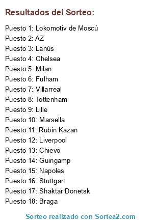 Lista de participantes: Villarreal, Liverpool, Chelsea, Lanús, Guingamp, Braga, Lokomotiv de Moscú, Chievo, Marsella, AZ, Shaktar Donetsk, Fulham, Milan, Napoles, Tottenham, Lille, Rubin Kazan, Stuttgart.