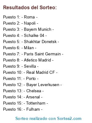 Lista de participantes: - Tottenham -, - Porto -, - Bayer Leverkusen -, - Milan -, - Schalke 04 -, - Arsenal -, - Sevilla -, - Shakhtar Donetsk -, - Bayern Munich -, - Chelsea -, - Napoli -, - Atletico Madrid -, - Roma -, - Real Madrid CF -, - Paris Saint Germain -, - Fulham -.