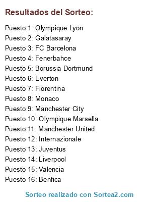 Lista de participantes: Olympique Lyon, Fenerbahce, Olympique Marsella, Benfica, FC Barcelona, Internazionale, Liverpool, Borussia Dortmund, Monaco, Valencia, Juventus, Manchester United, Fiorentina, Galatasaray, Everton, Manchester City.