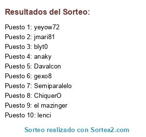 Lista de participantes: blyt0, yeyow72, ChiquerO, gexo8, anaky, Davalcon, jmari81, el mazinger, lenci, Semiparalelo.
